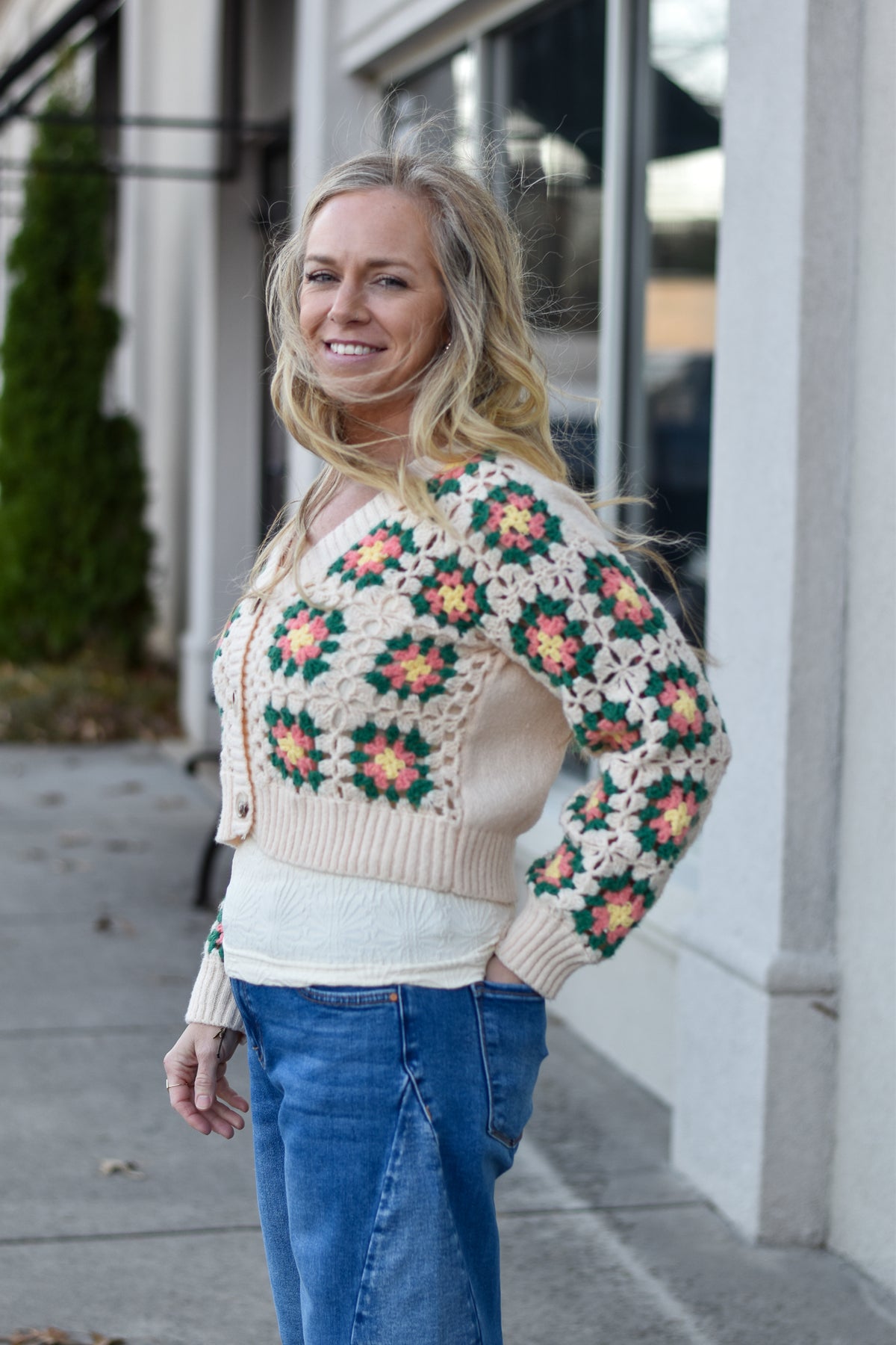 The Retro Crochet Cardigan brings all the vintage charm with its multicolor crochet knit, relaxed fit, and easy button-front style. Cozy, colorful, and perfect for layering year-round.