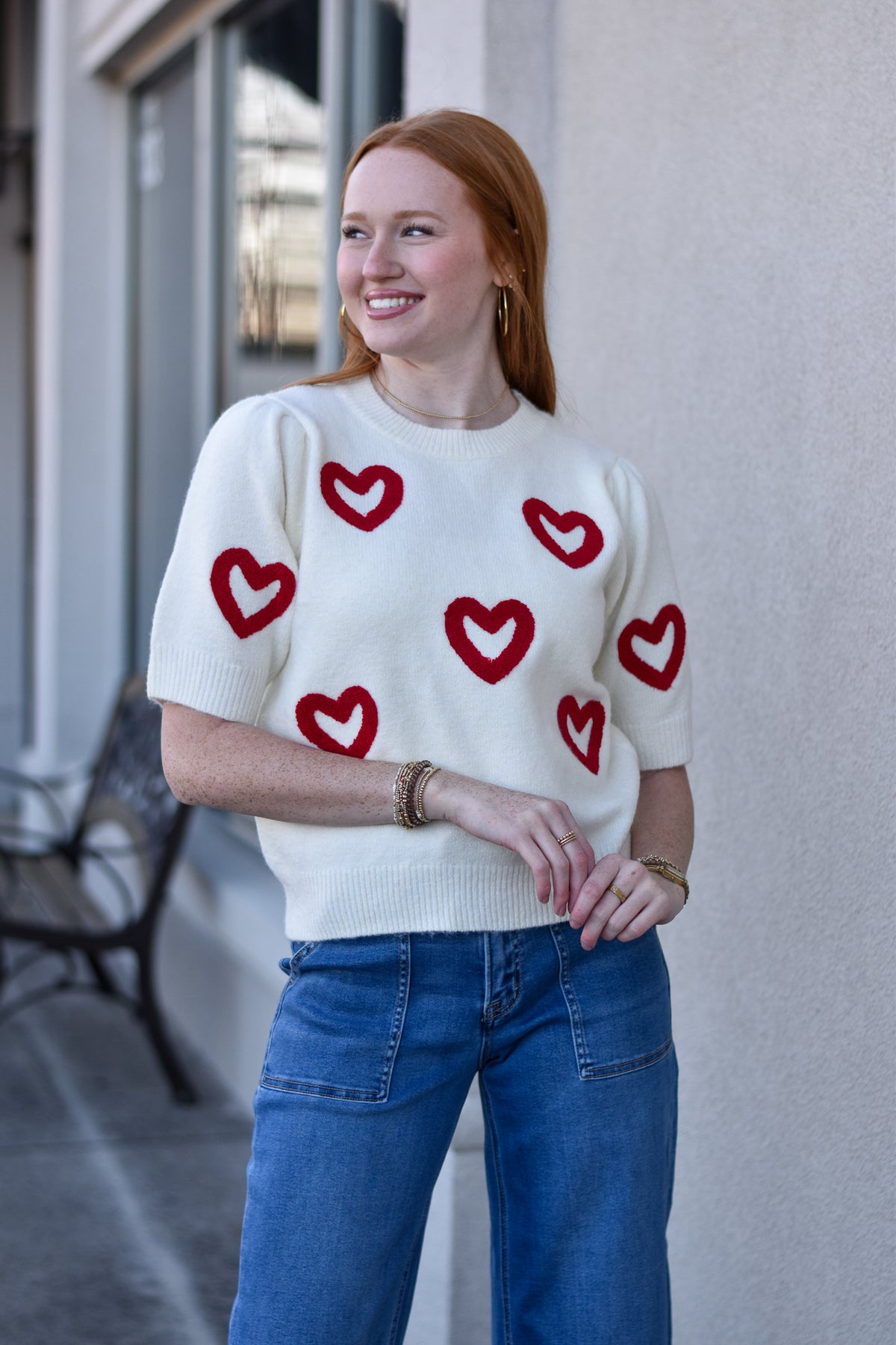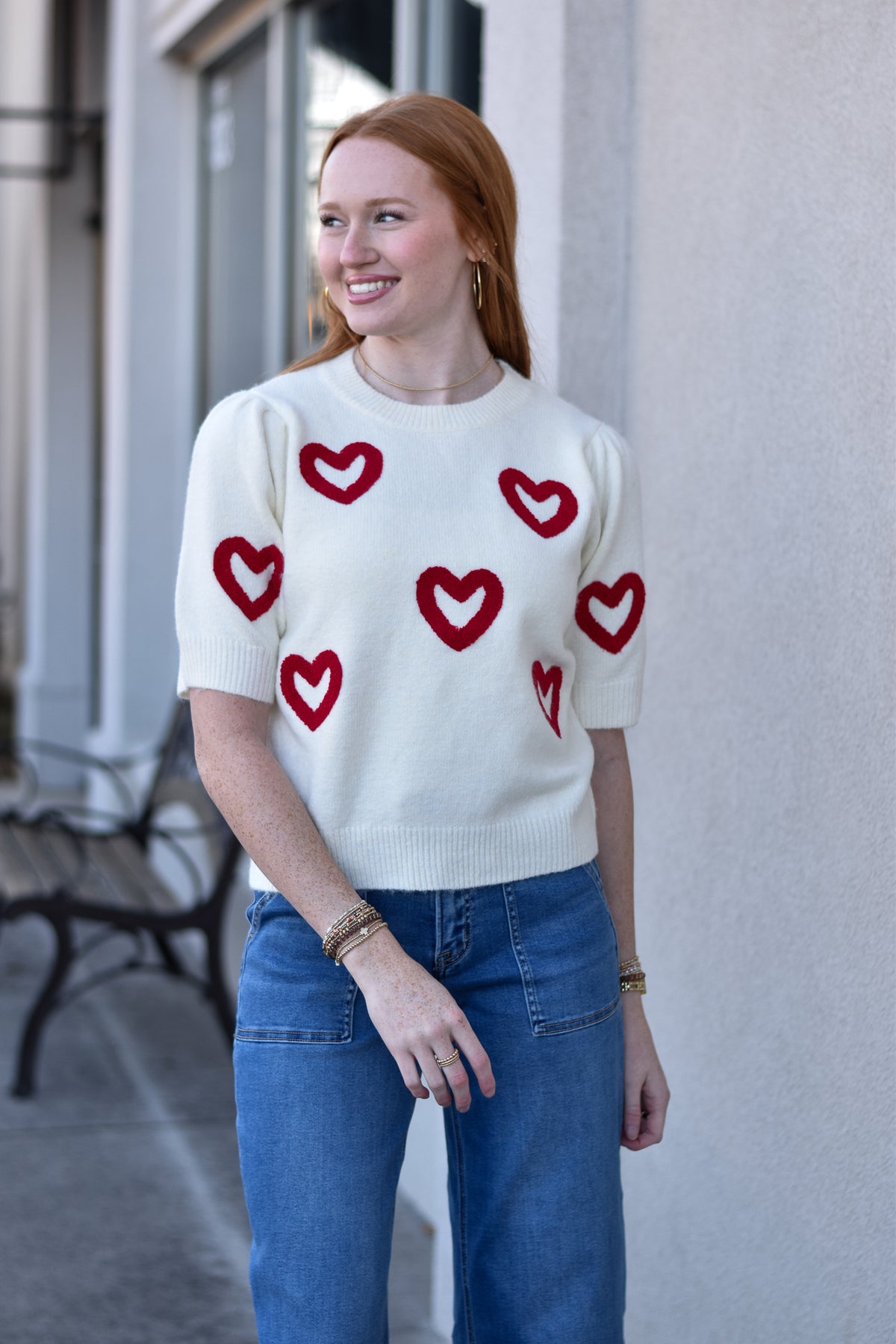 Cozy, cute, and full of charm—the Heart Pattern Knit Sweater brings a playful touch to your everyday style. Made with soft yarn and finished with a classic round neckline and short sleeves, it’s the perfect feel-good piece for Valentine’s Day or any day you want a pop of sweetness.