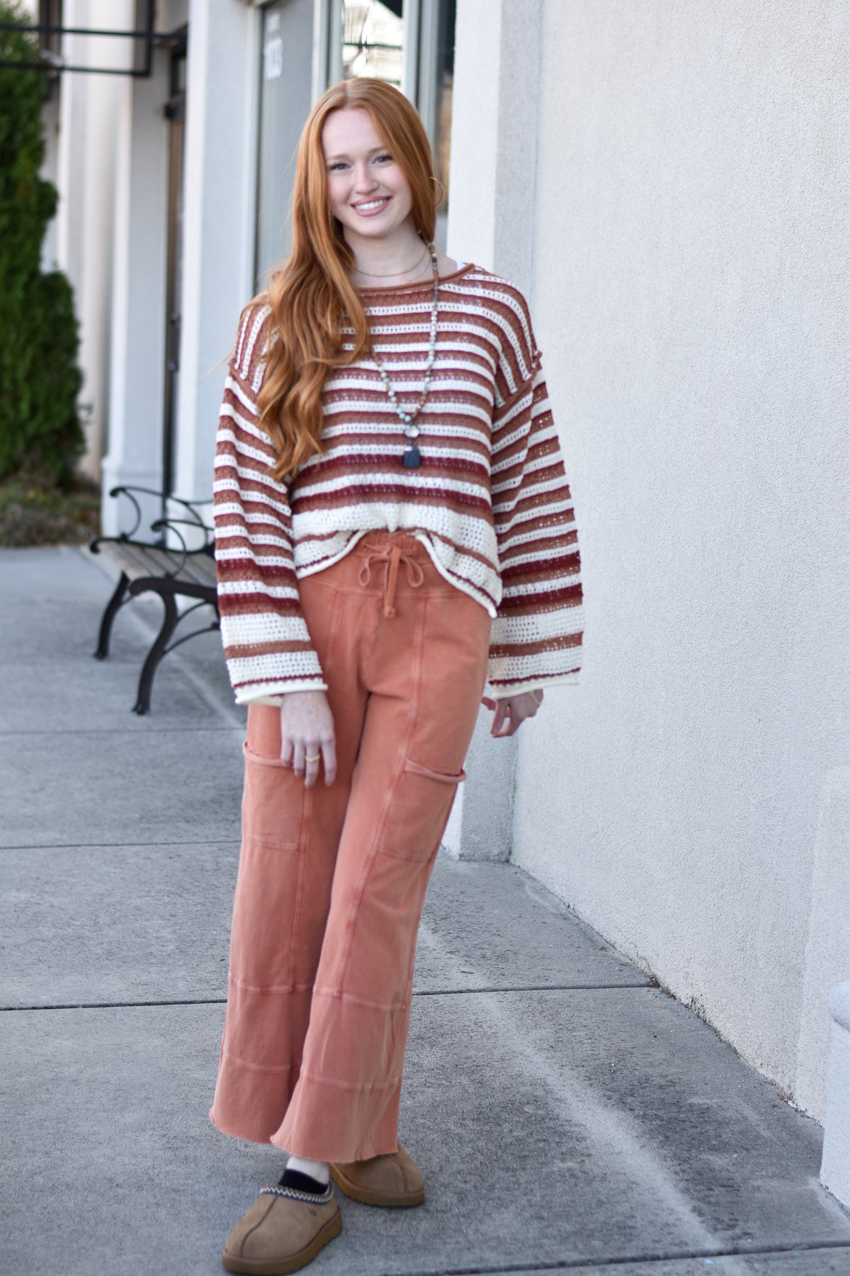 Effortlessly cute and cozy, this striped crochet knit sweater brings laid-back charm to any day. With its airy open-knit texture, boat neckline, and relaxed boxy fit, it’s the perfect throw-on piece for transitioning through the seasons.