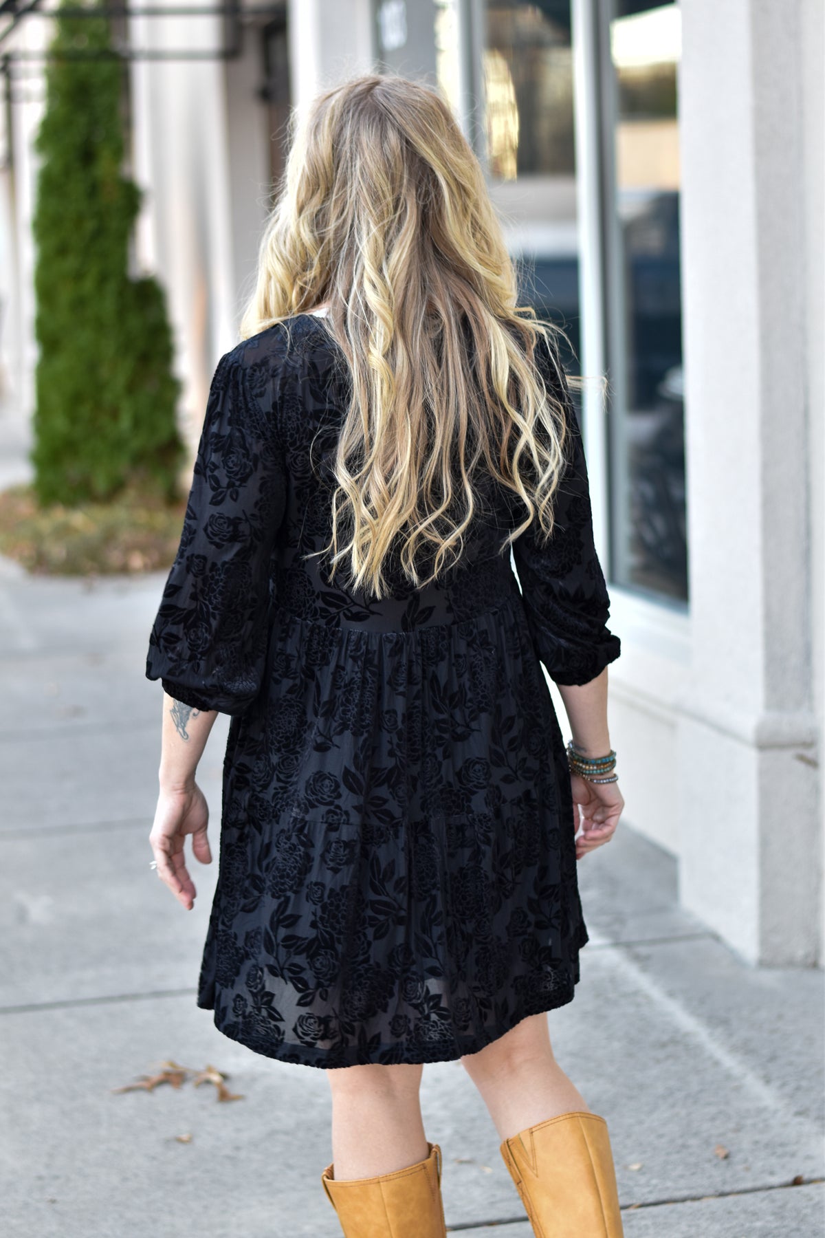 Soft, embossed velour gives this babydoll dress a luxe touch you’ll love. Designed with a deep neckline, long sleeves, and a flirty mini length—perfect for holiday parties or a chic night out.