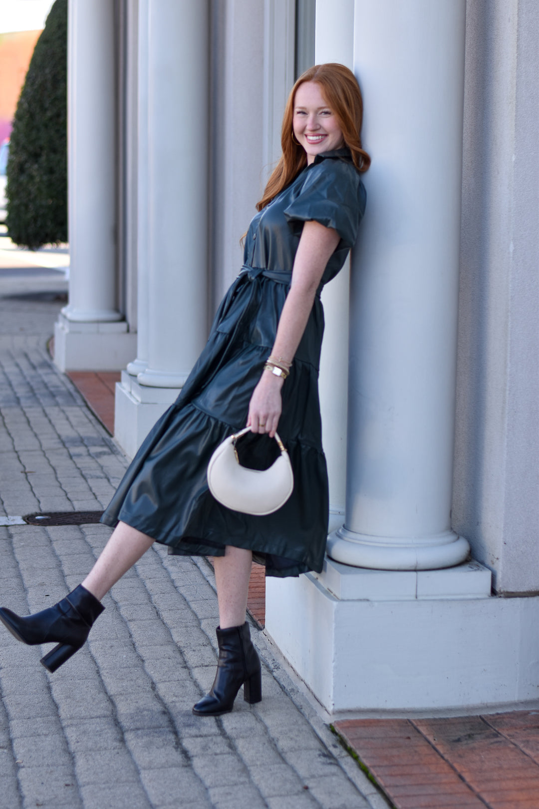 Pinch Tiered Faux Leather Midi Dress