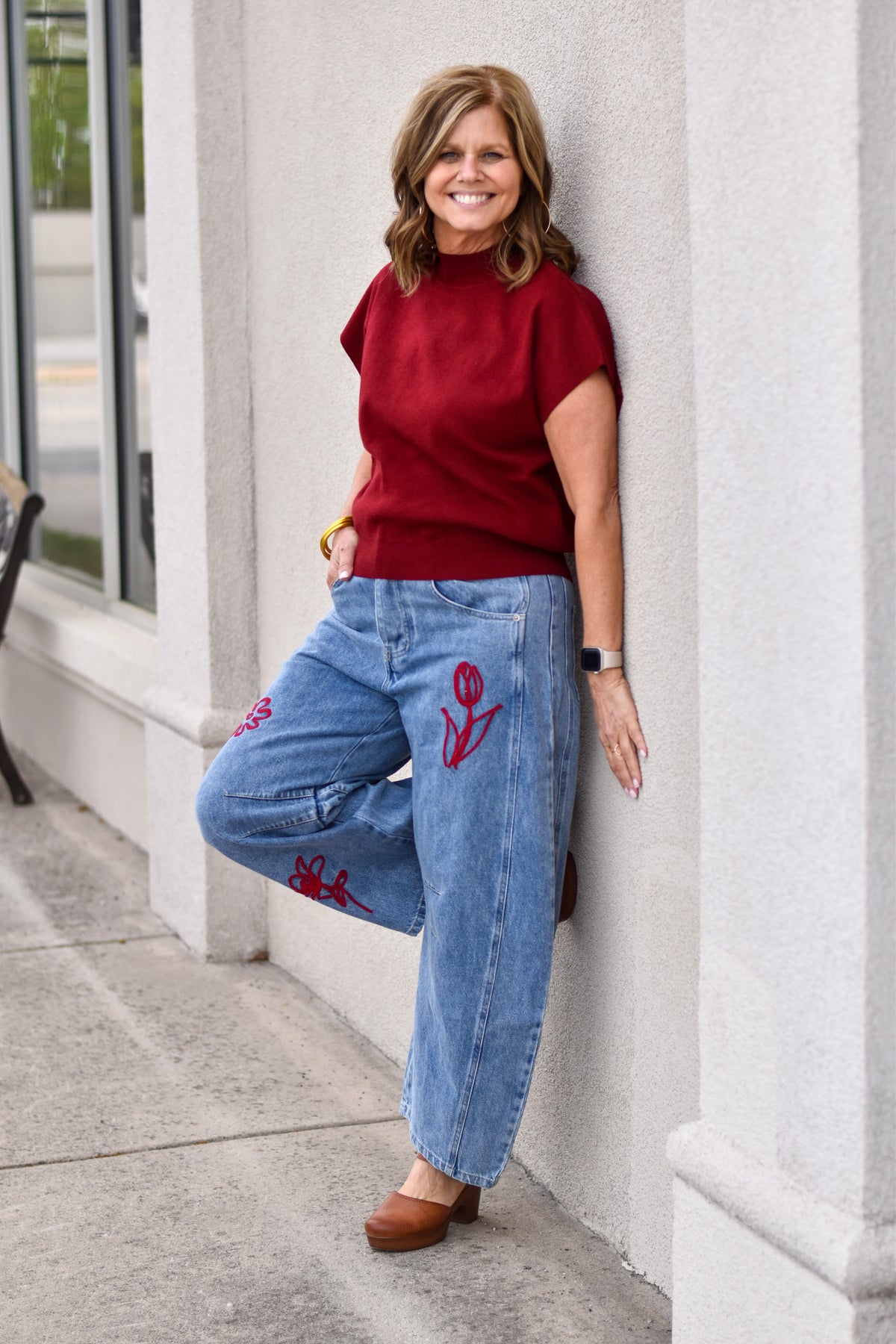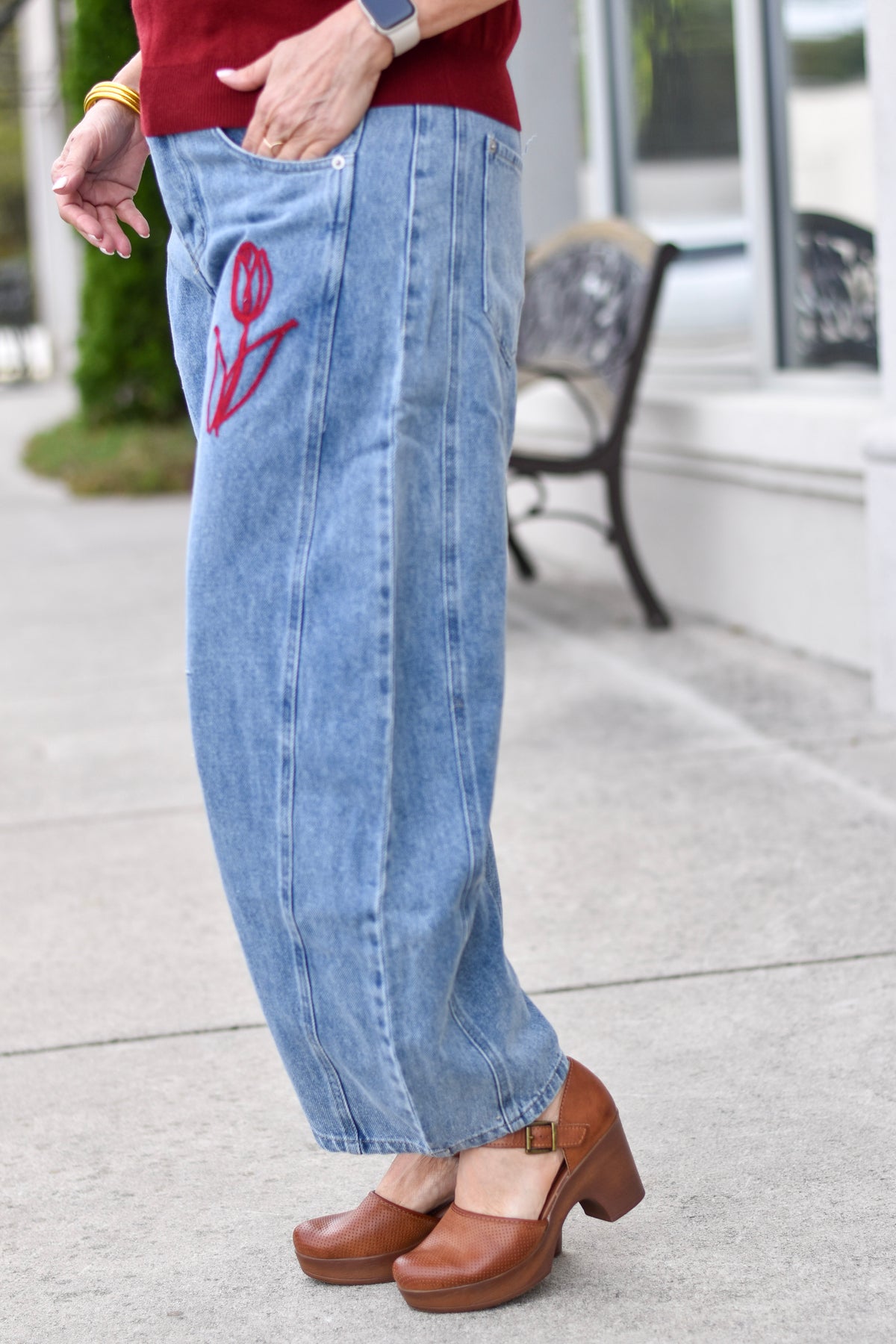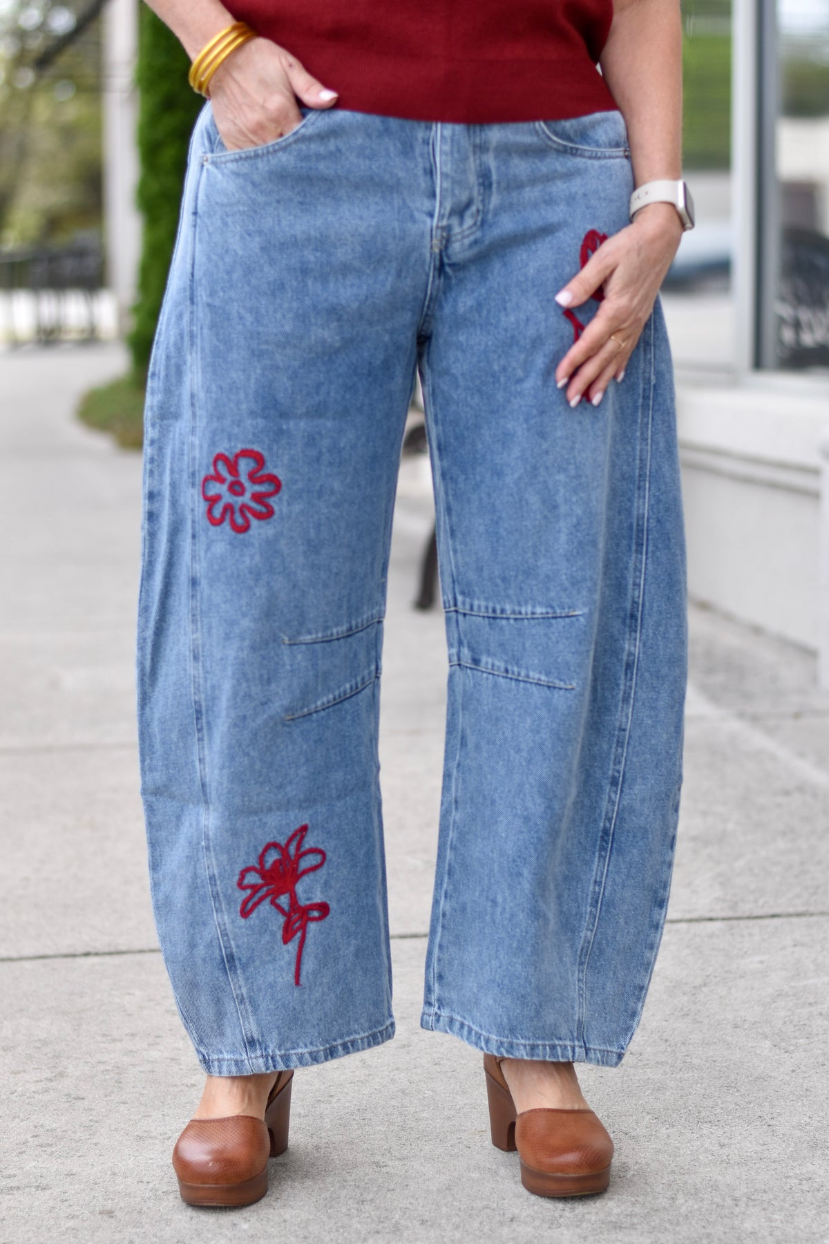 Effortlessly cute and casually chic, these floral embroidered barrel-leg jeans feature a flattering wash and soft, comfortable fabric for everyday wear.