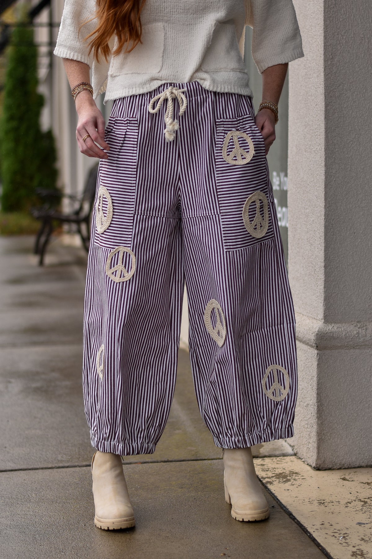 Embrace easygoing boho vibes with the Peace & Pinstripes Palazzo Pants. Featuring playful peace sign patches, soft pinstripes, and a relaxed wide-leg silhouette, these pants bring effortless charm and all-day comfort to your look.
