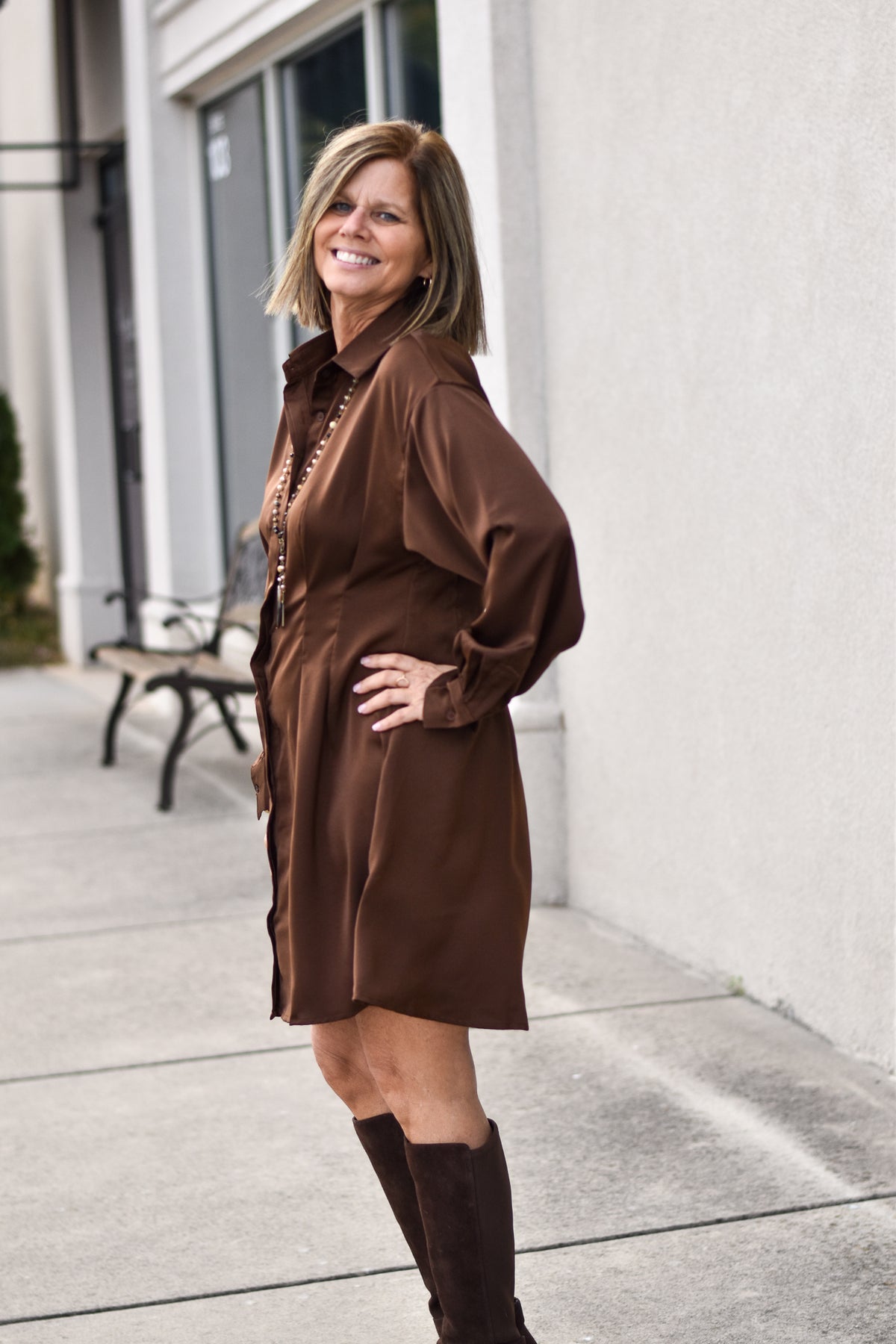 Polished, feminine, and effortlessly chic. This satin mini features a collared neckline, pleated waist, and a soft sheen that shines from day to night. ✨