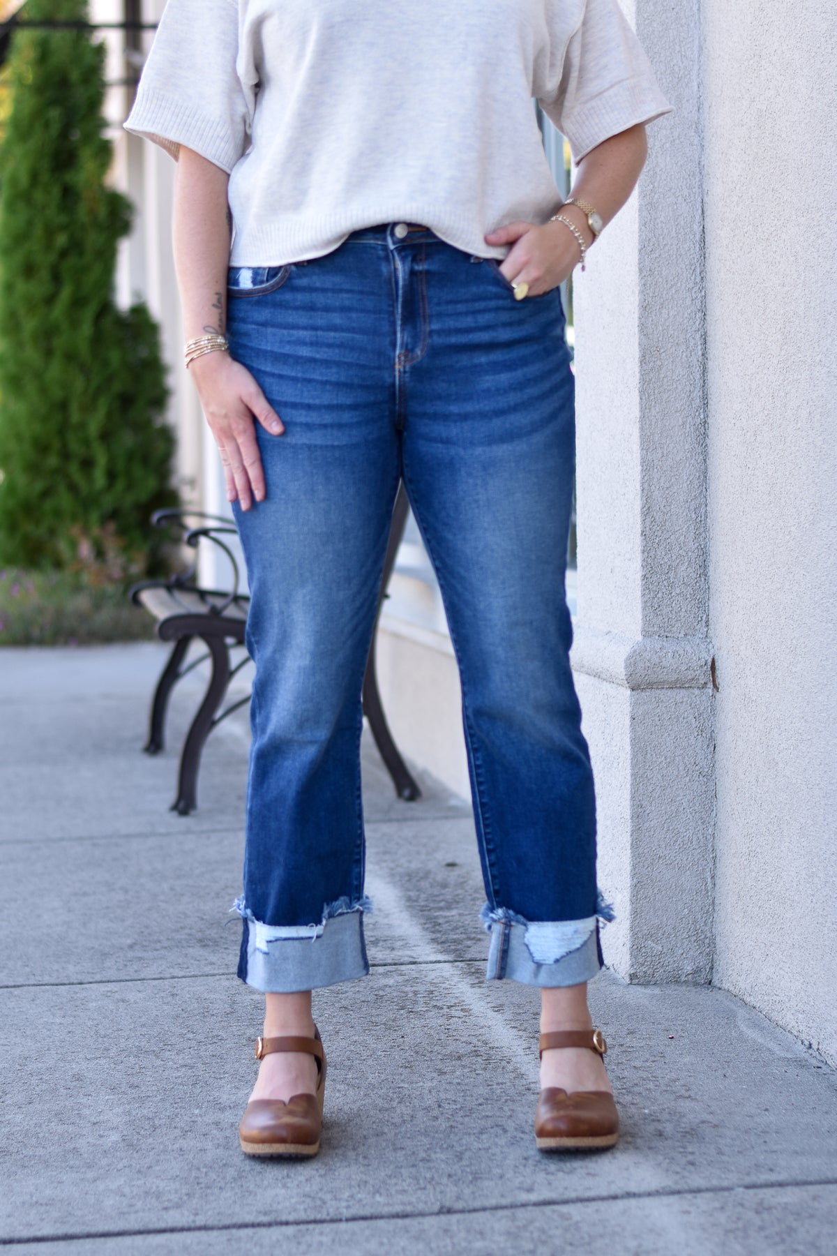 A little lived-in, a lot of stretch—these cuffed straight-leg jeans by Zenana bring effortless style and comfort to your everyday lineup.