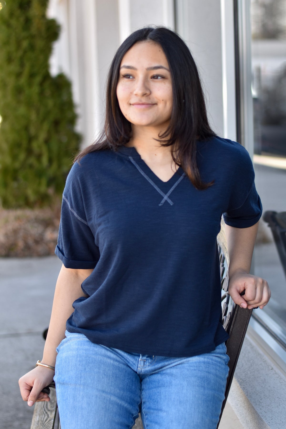Your go-to warm-weather essential. This lightweight, slightly stretchy knit top features cuffed sleeves and playful contrast stitching—perfect for easy, everyday wear in the sun.