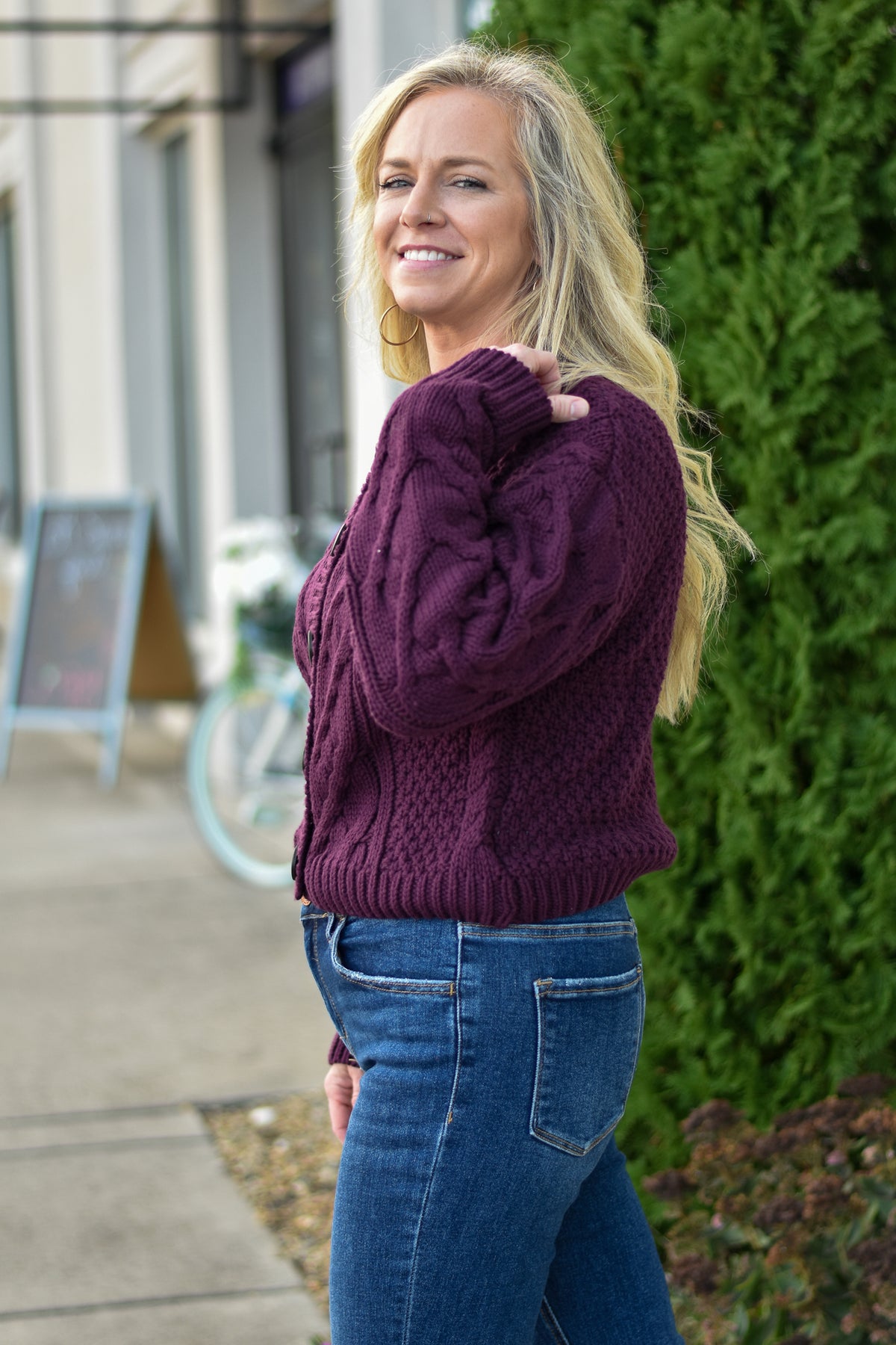 The Heritage Cable Cardigan is a timeless layer with modern charm. Knit in soft 100% cotton, this cropped silhouette features rich cable texture, classic crew neckline, and dark contrast buttons for an elevated finish. Perfect for cozy days or polished layering.