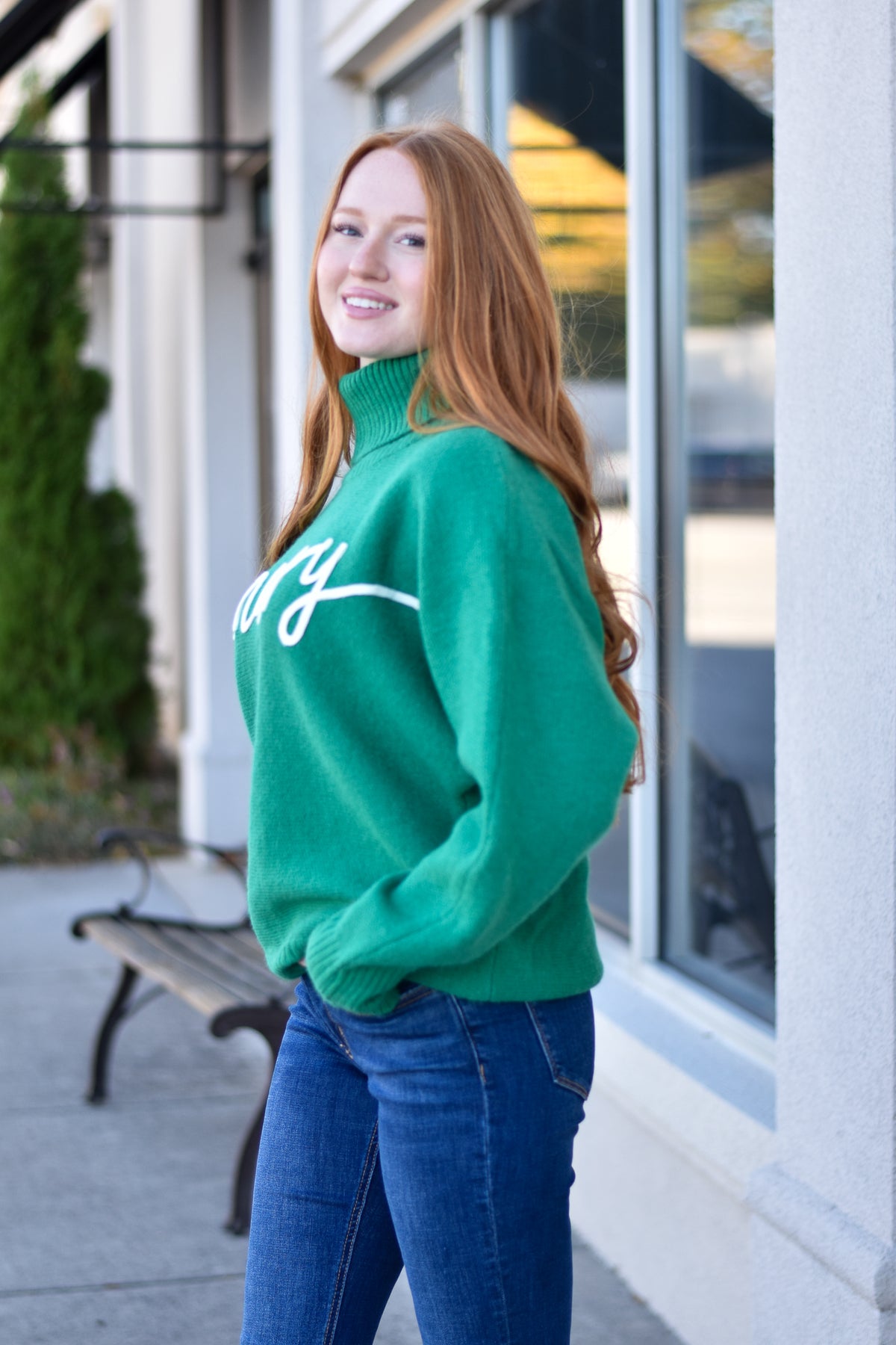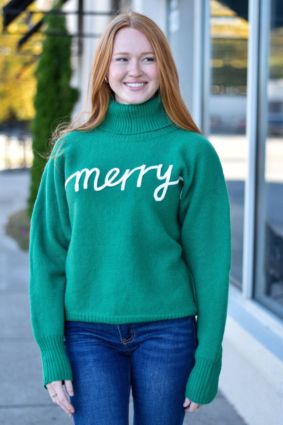 Bring on the holiday cheer with the Very Merry Turtleneck Sweater. This cozy evergreen knit features a playful “Merry” graphic in bold cursive and polished ribbed trims—perfect for adding festive flair to your winter wardrobe.