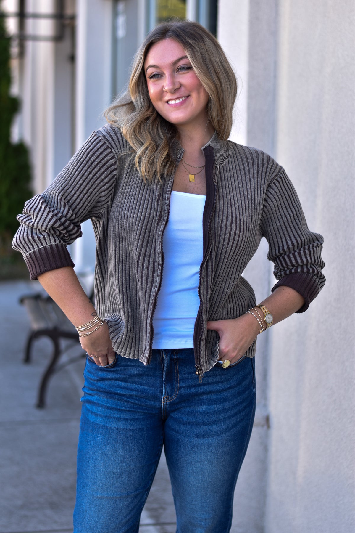 A cozy classic with a modern twist. This two-tone zip-up sweater features a soft, stretchy knit, double zipper detail, and cuffable sleeves for effortless style and comfort.