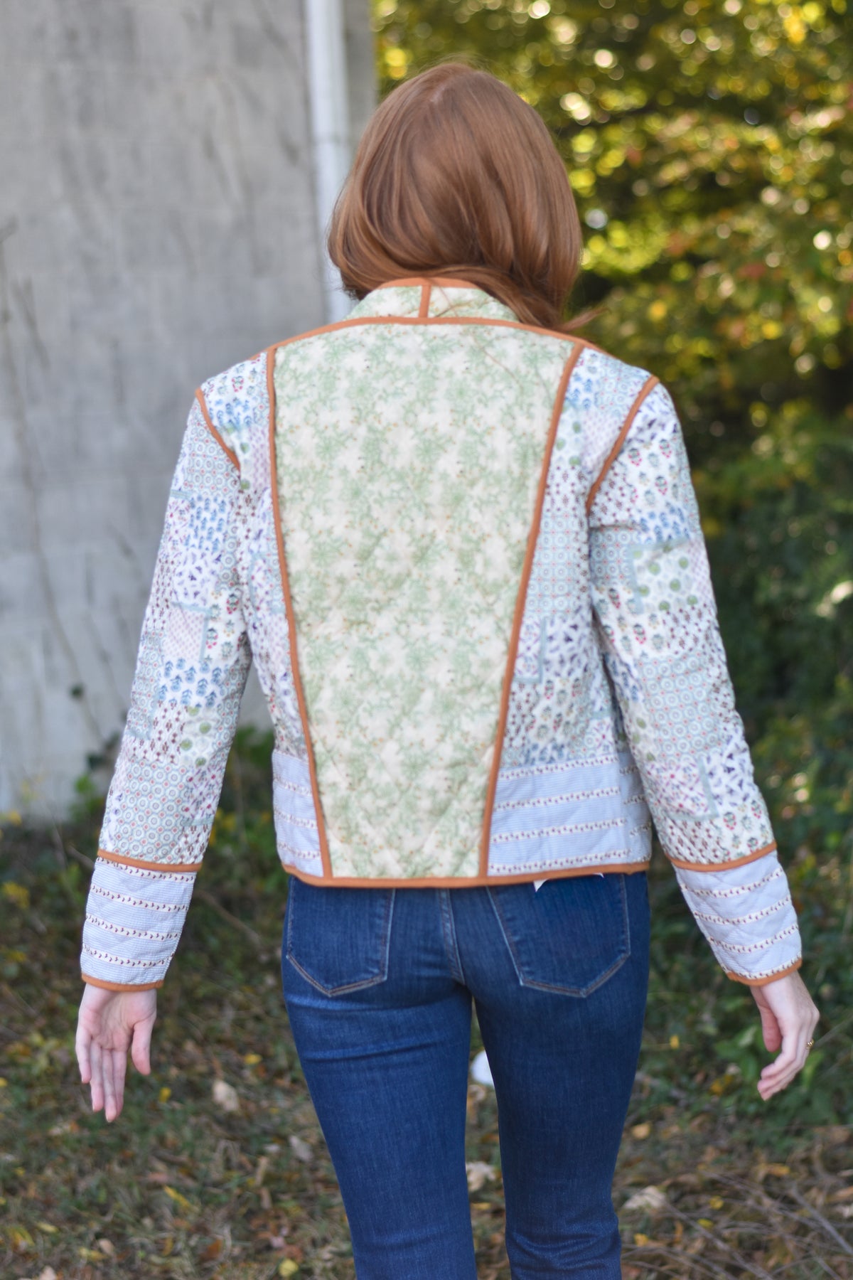 A vibrant boho-inspired jacket featuring patchwork floral and geometric prints. Quilted texture and a relaxed, boxy fit make it perfect for layering over your favorite casual looks.