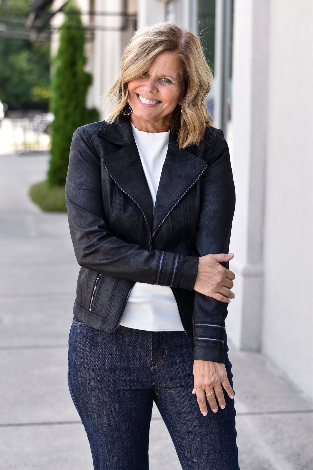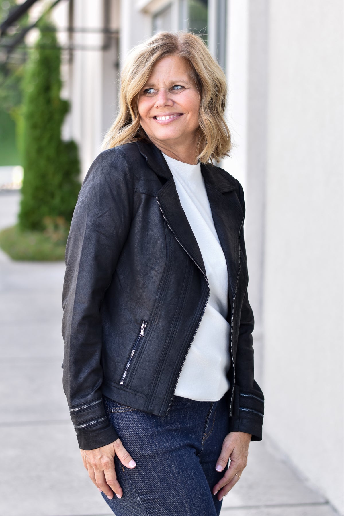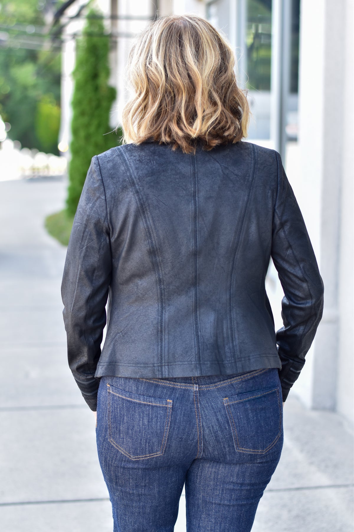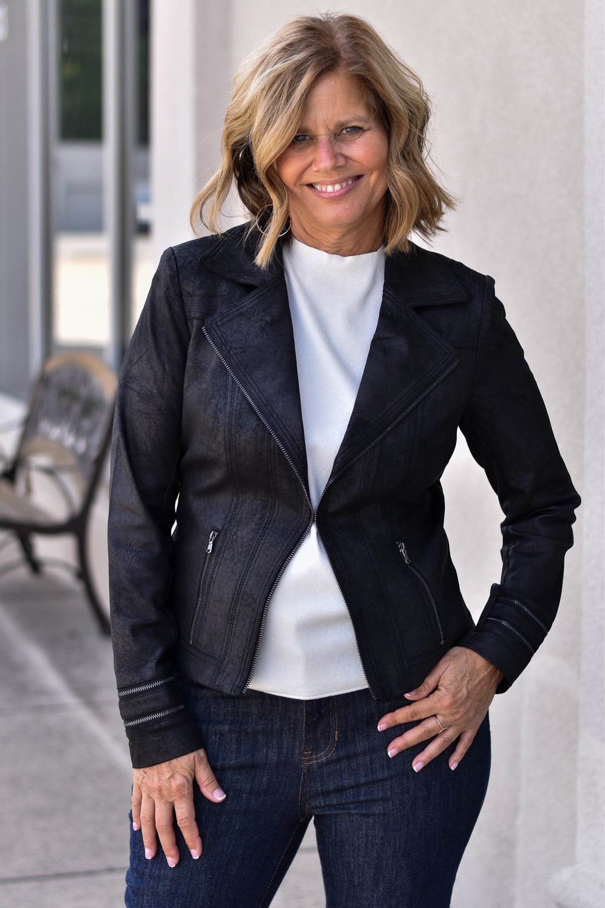 A vintage-inspired faux leather jacket with zipper details and a soft, edgy vibe—effortless style for casual days or night outings.