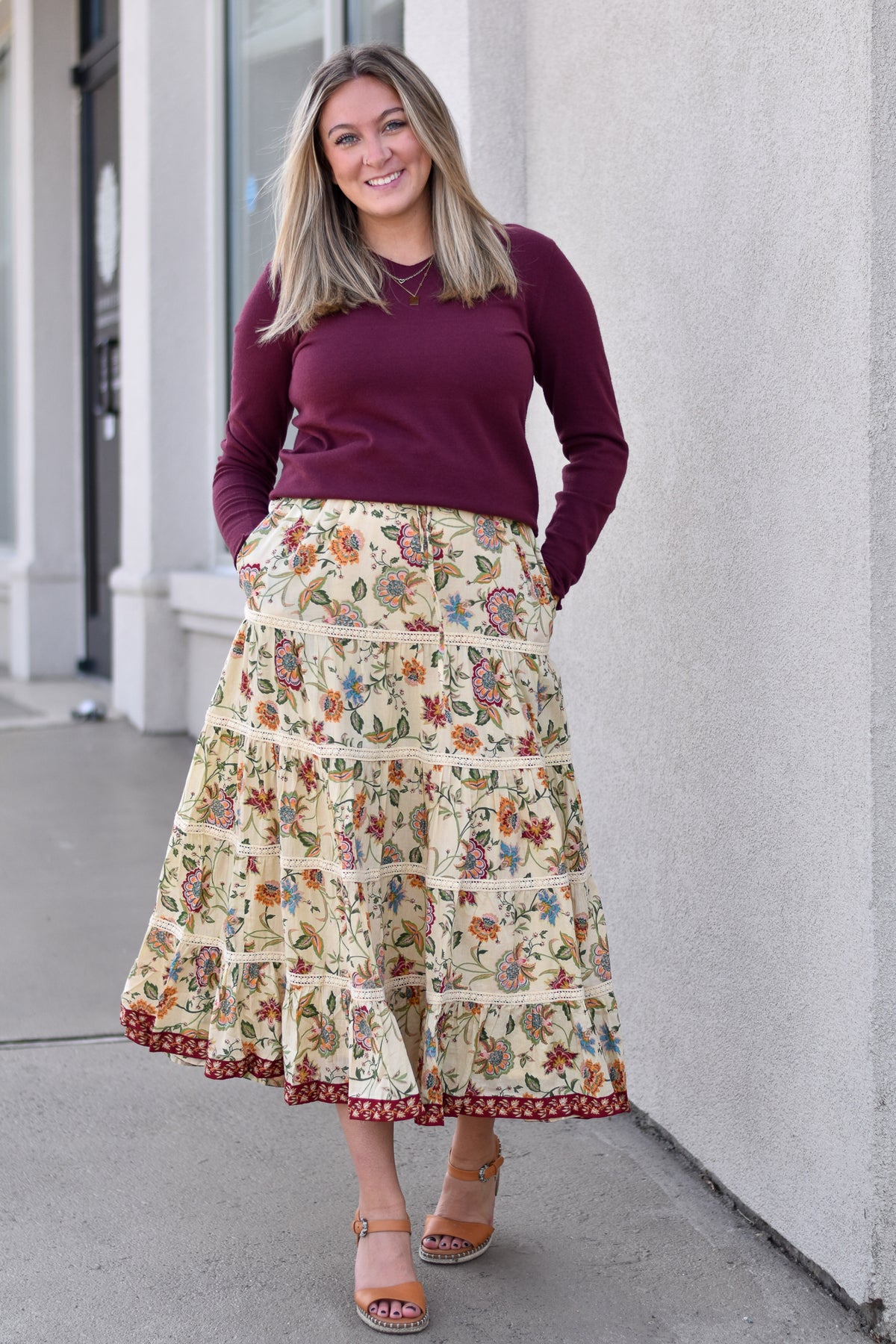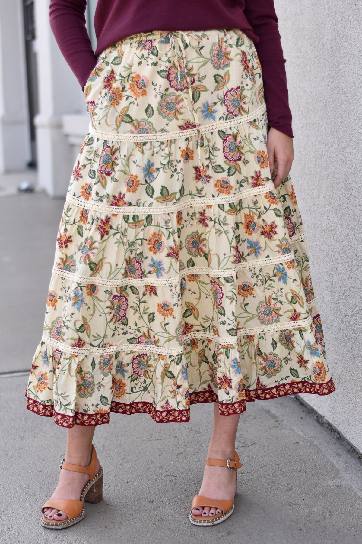 The Pandora Skirt is a boho dream—beautifully printed with tiered layers, lace trim, and a stylish tie detail. Made from 100% cotton with handy side pockets, this mid-length skirt is both effortless and chic. Perfect for twirling into the season.