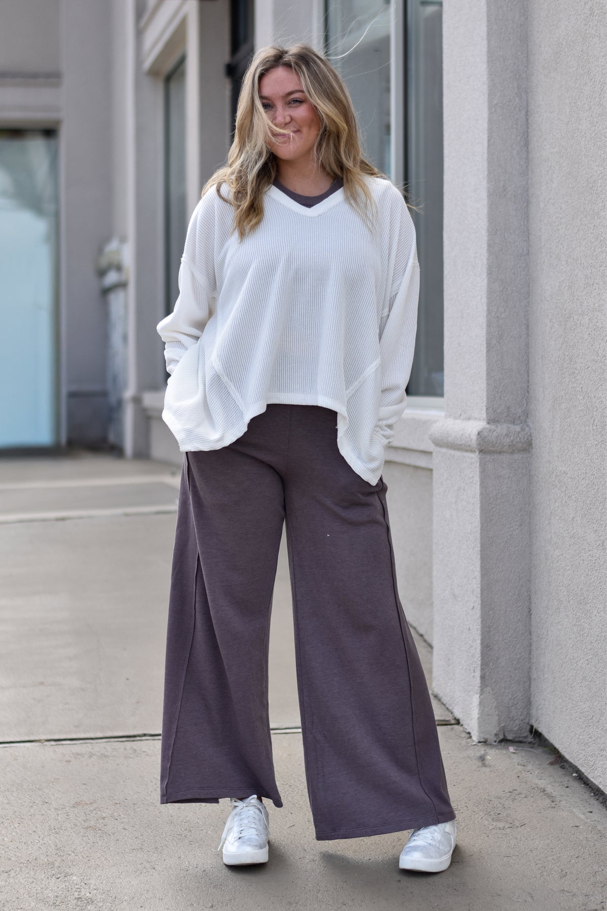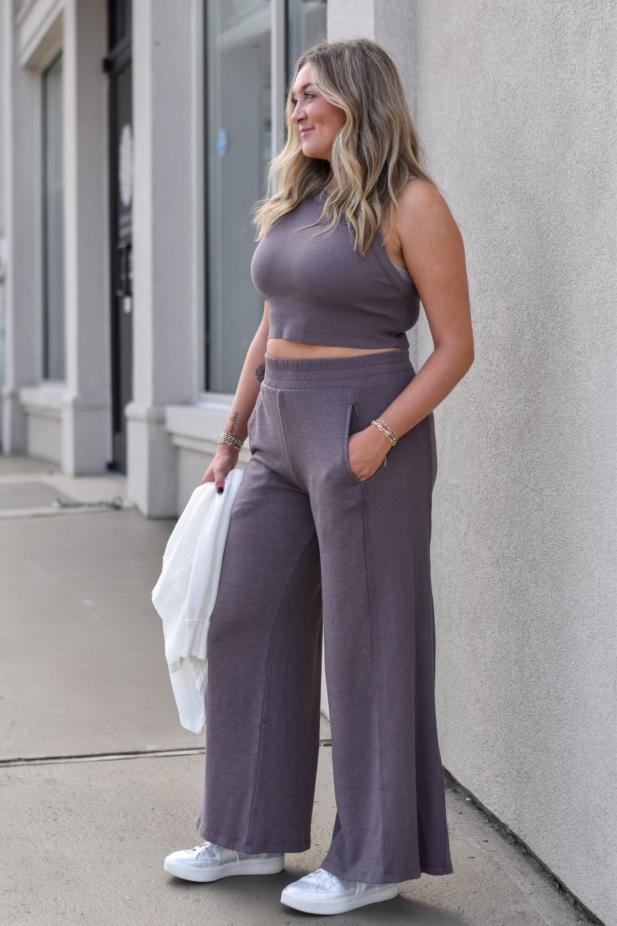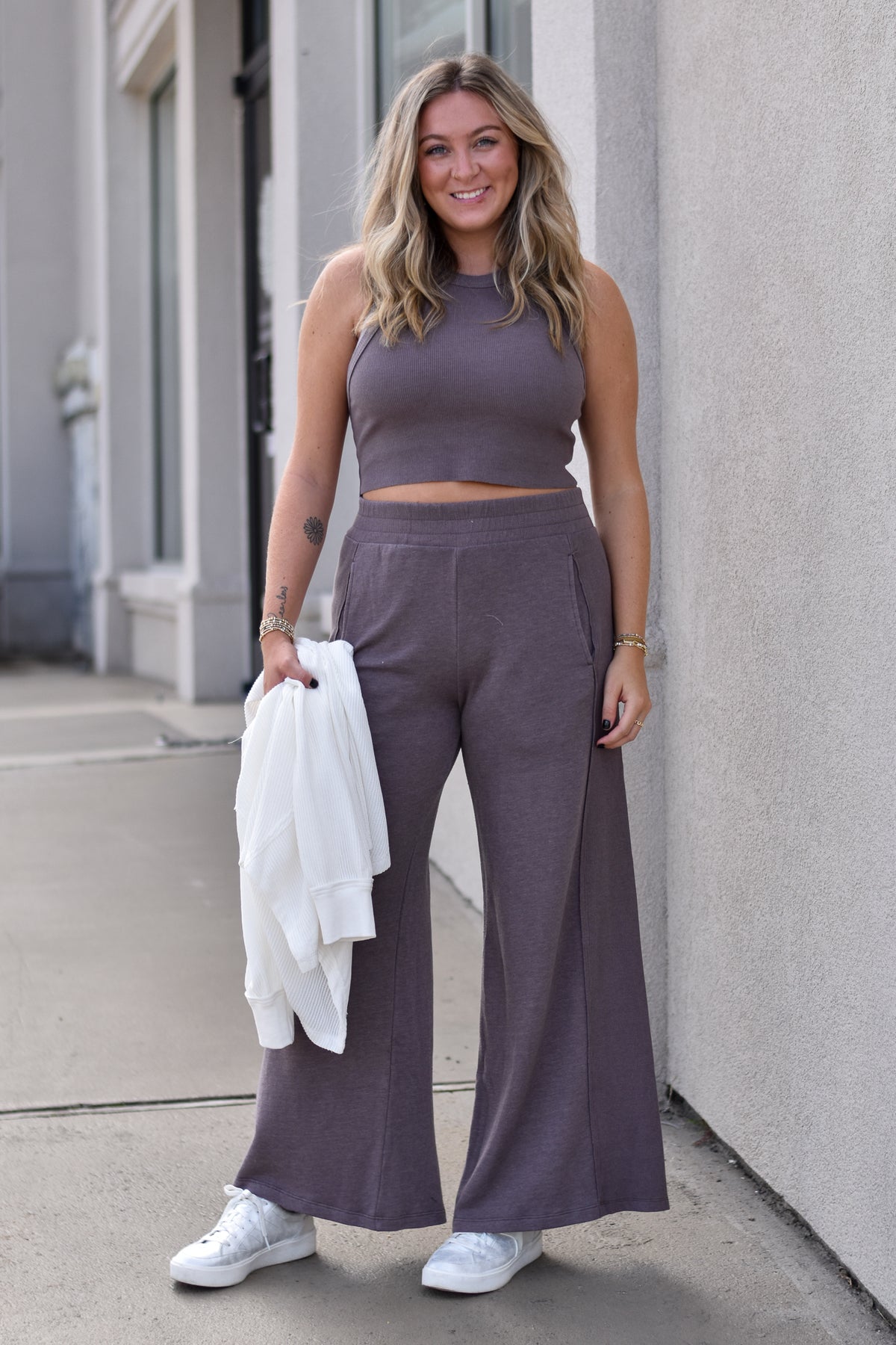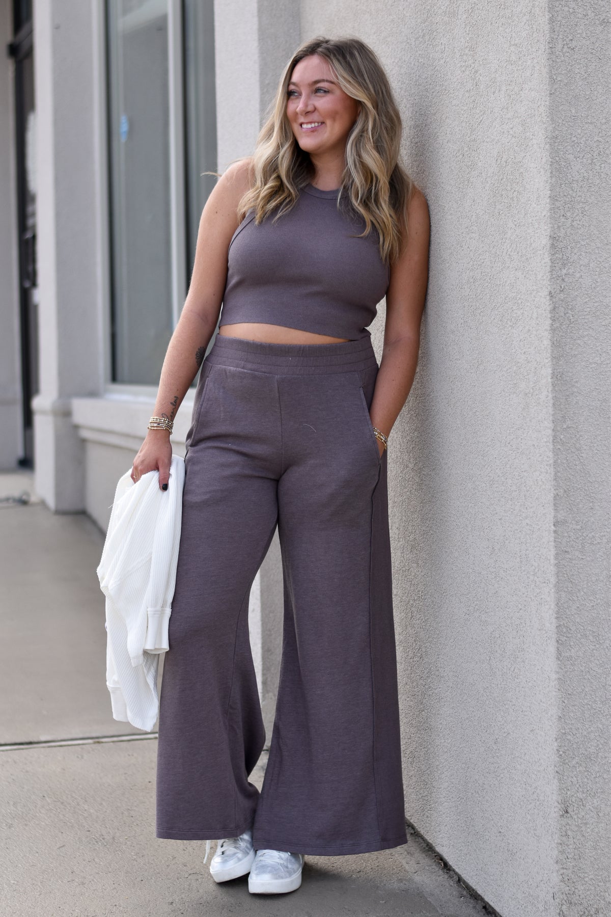 Introducing the Free Vibes Solange Set - style and comfort in one trendy package! This set includes a halter neck tank crop top and coordinating, wide leg opening rib pants. With a stretch fabrication, you'll be turning heads and feeling comfortable all day long. Add an oversize top for a fun, casual look.