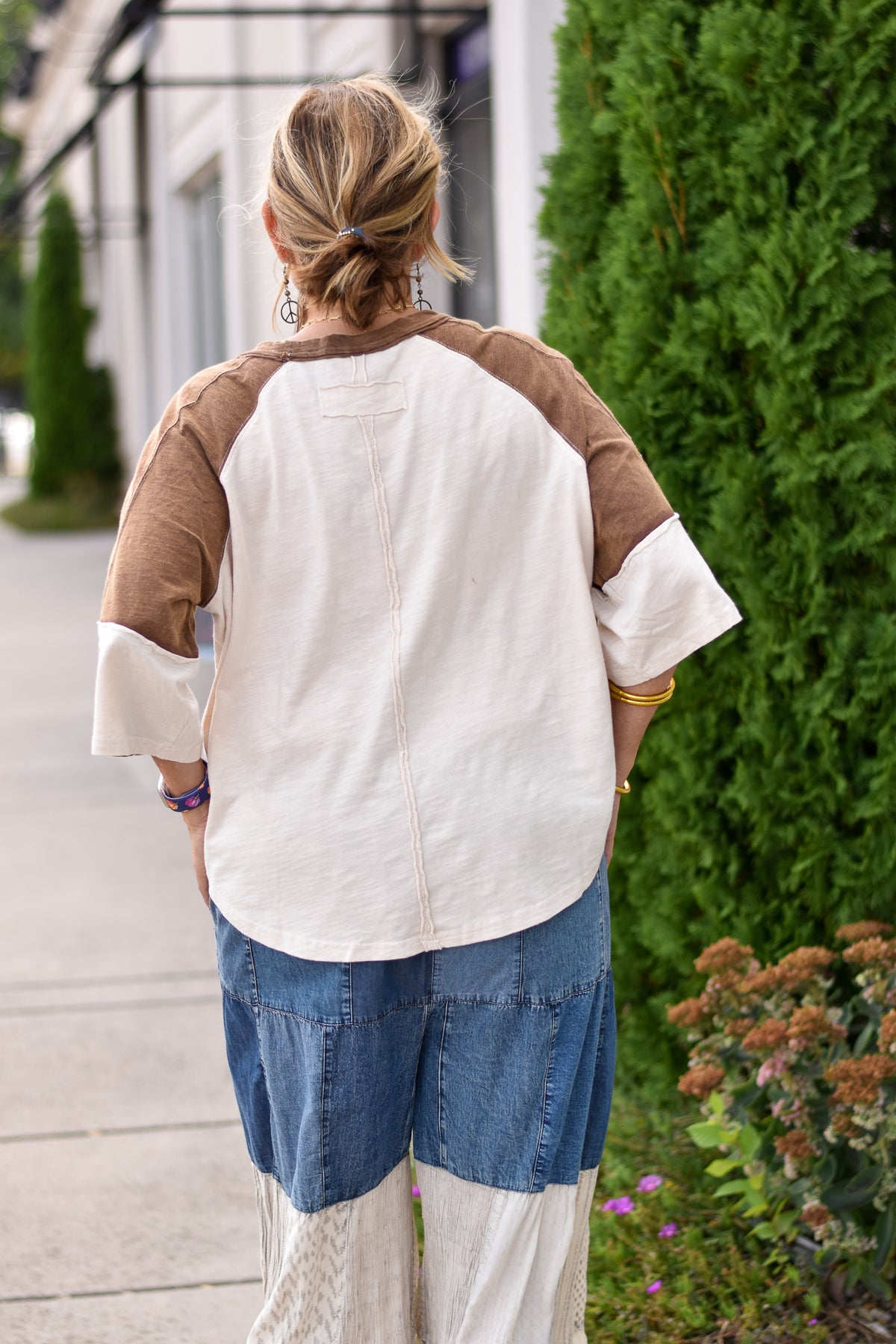 Laid-back and free-spirited, this mineral wash color block top blooms with a peace sign floral patch—effortless boho vibes in an oversized fit.